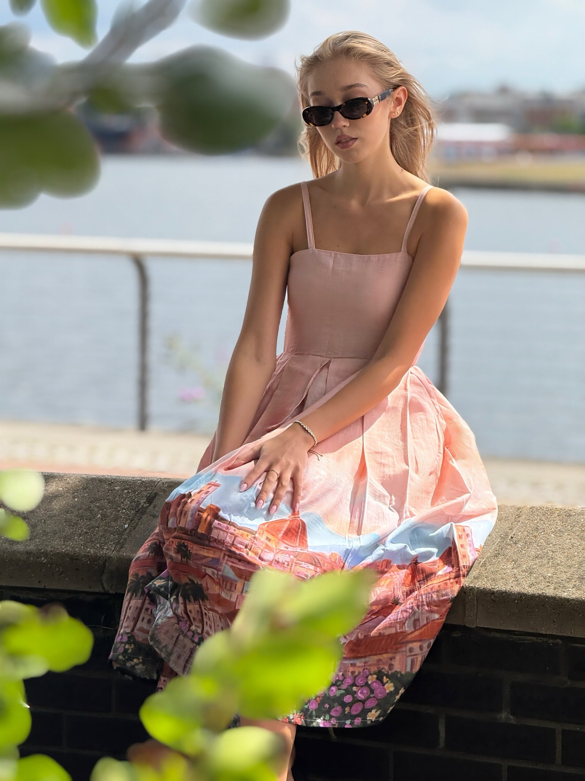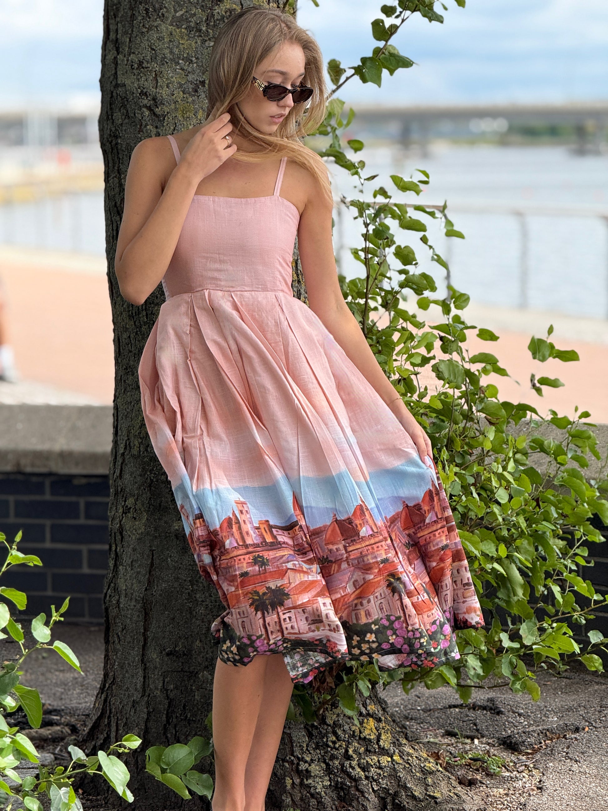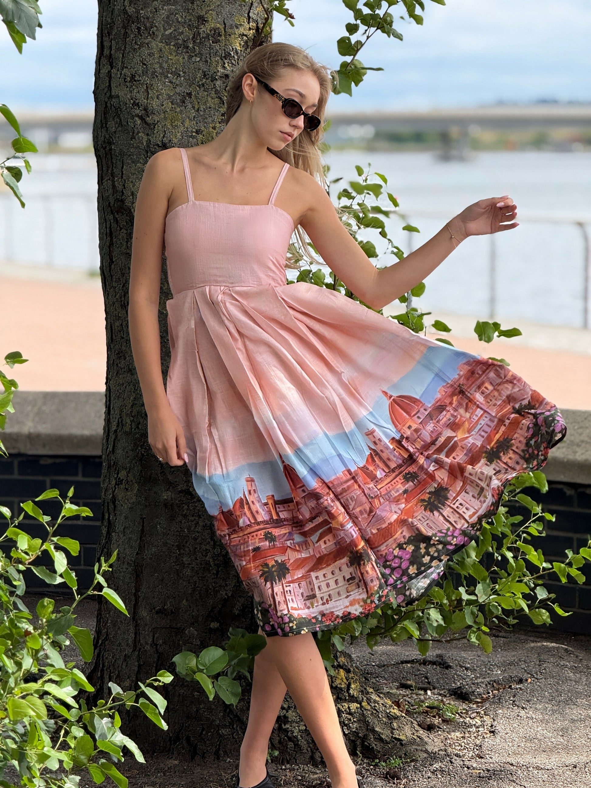 Romantic, graceful, and effortlessly charming β the Dolce Florence Dress is inspired by dreamy European summer escapes. Designed with a soft blush-toned bodice and delicate shoulder straps, this dress flows into a beautifully illustrated skirt featuring a picturesque cityscape print with floral accents along the hem.