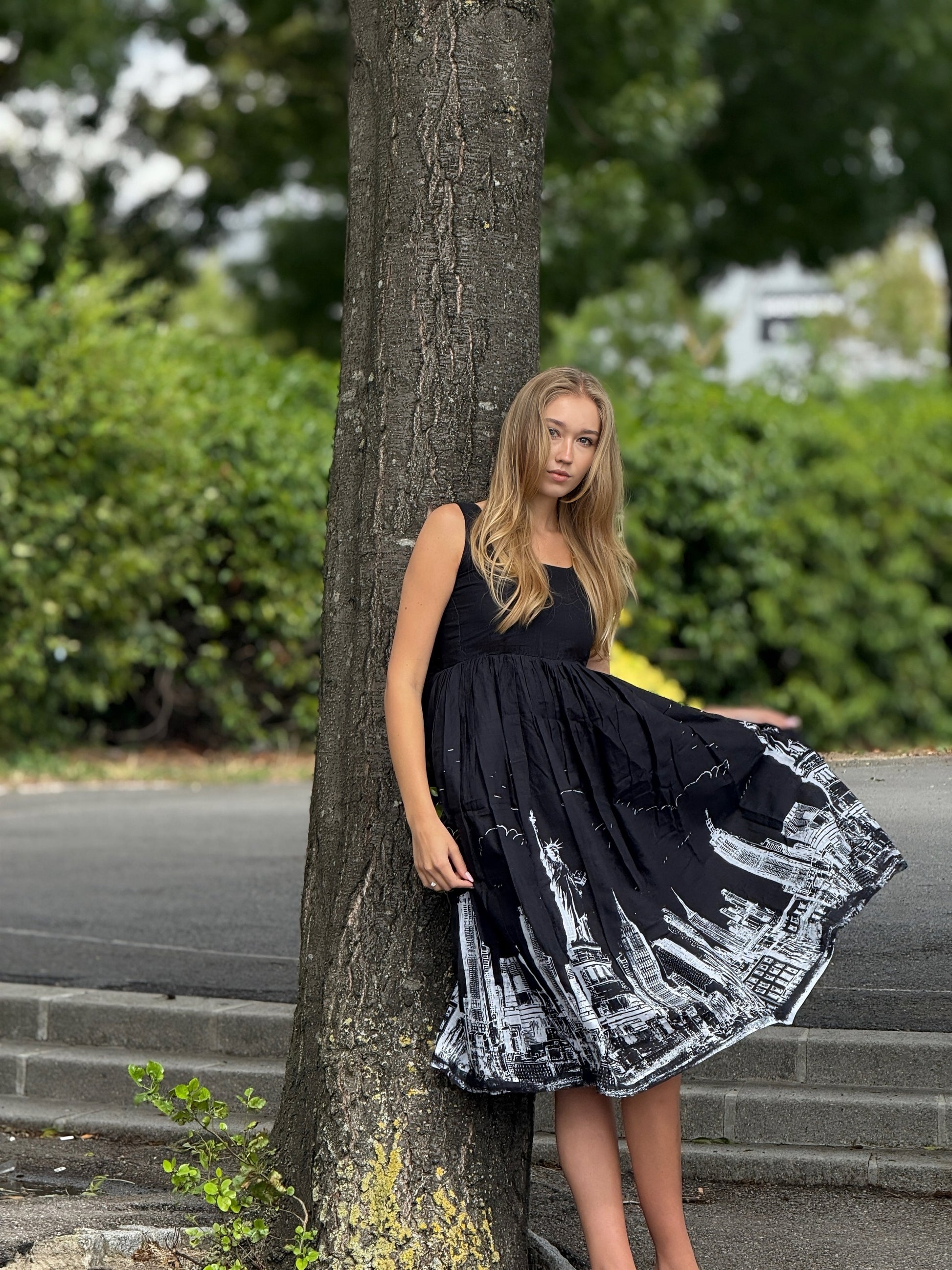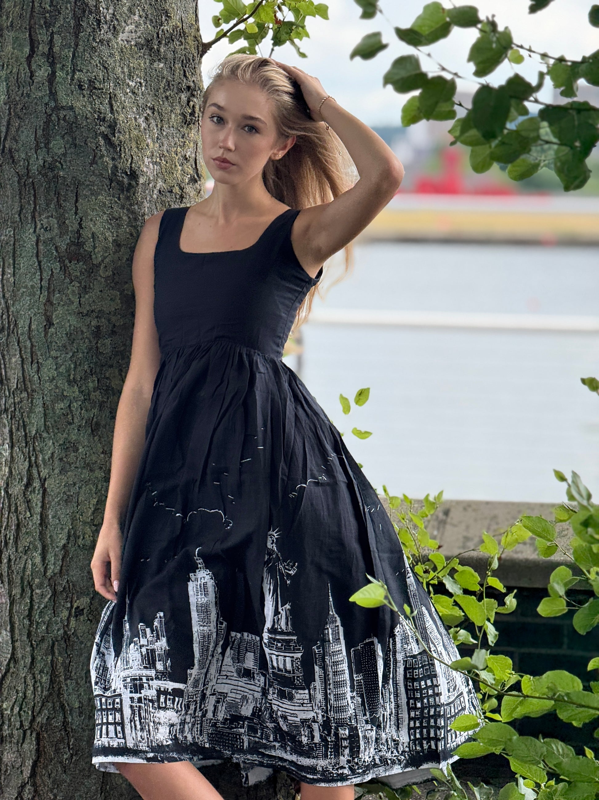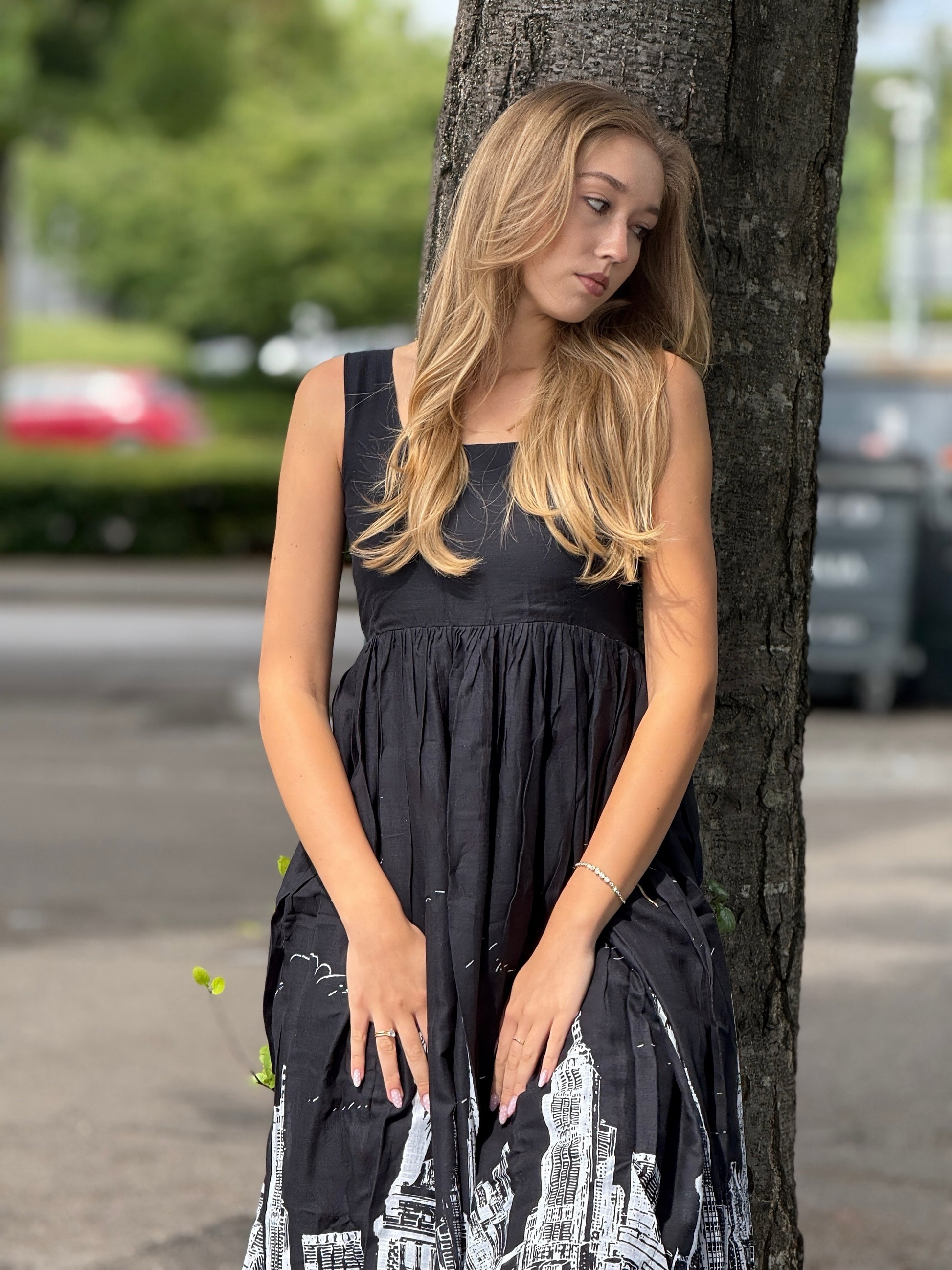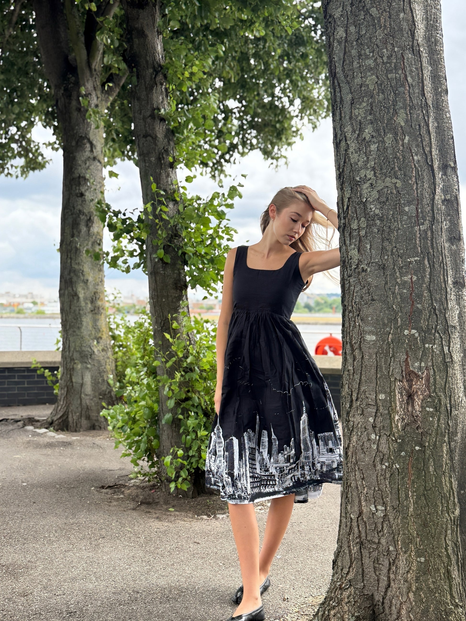 Bold, timeless, and effortlessly chic — the New York City Print Dress captures the spirit of the city that never sleeps. Designed with a classic black bodice and a beautifully illustrated skyline print along the hem, this dress blends modern sophistication with artistic flair.